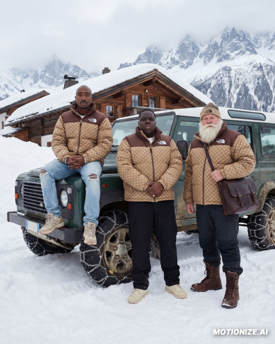 A winter mountain scene featuring Tupac, Biggie Smalls, and Santa Claus posing in front of a rugged green Land Rover Defender fitted with heavy snow chains. Fresh snow blankets the ground and a wooden alpine lodge behind them, with dramatic cloudy mountains rising in the background. All three individuals wear matching tan-and-brown quilted winter jackets featuring The North Face logo on the chest, styled in a high-end, luxury designer pattern. Tupac sits on the hood of the Defender with hands clasped, wearing ripped light-blue jeans and beige sneakers. Biggie stands in the middle in front of the left wheel with hands folded, wearing black pants and cream-white shoes. Santa Claus stands on the right, wearing the same matching luxury jacket paired with dark winter trousers, heavy leather boots, and a knit beanie, perhaps holding a stylish leather sack. The overall look is cold, stylish, and adventurous, combining luxury winter fashion with rugged off-road aesthetics.