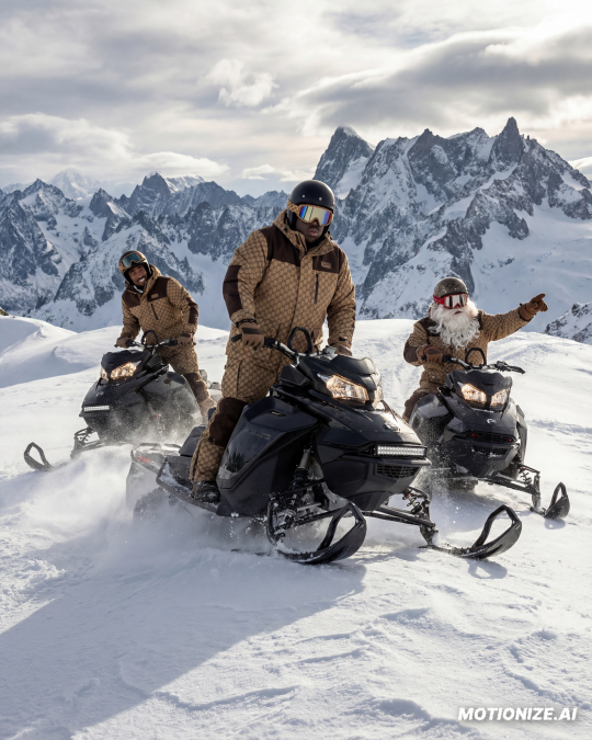 A dynamic, wide-angle landscape photograph of Tupac, Biggie Smalls, and Santa Claus riding customized, sleek black snowmobiles across a pristine, deep-powder snowfield. They are wearing matching heavy-duty technical snowsuits that feature a high-fashion tan-and-brown designer monogram pattern, complete with matching helmets and oversized ski goggles. Biggie is in the lead on a large snowmobile, kicking up a roost of snow. Tupac rides alongside him, looking back at the camera. Santa Claus rides the third snowmobile, looking adventurous, with his white beard flowing out from under his helmet and wearing the same monogrammed snowsuit. Dramatic, jagged mountain peaks rise sharply in the background under a partly cloudy sky. The look is high-speed adventure meets high fashion.
