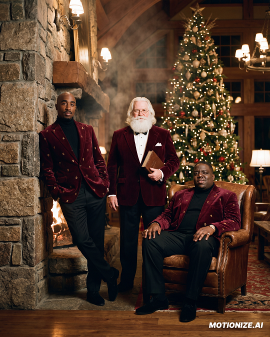 A cinematic evening photograph taken inside the massive timber-frame lobby of a five-star ski lodge. Tupac, Biggie Smalls, and Santa Claus pose formally in front of a colossal, floor-to-ceiling stone fireplace with a roaring fire. They are dressed in matching luxury evening wear: deep burgundy velvet blazers with subtle gold embroidery, black turtlenecks, and dark trousers. Tupac stands with hands in pockets, leaning slightly against the stonework. Biggie sits on a leather club chair, looking at the camera. Santa stands tall in the center, wearing the identical burgundy velvet blazer over a crisp white shirt, holding a leather-bound book. A massive, designer-decorated Christmas tree is visible in the background. The lighting is warm, ambient, and opulent.